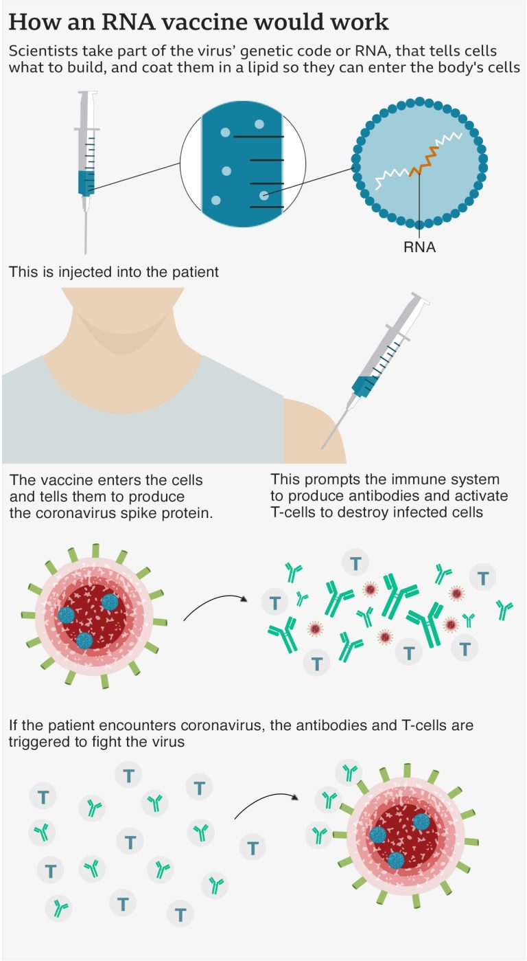 2.基因材料疫苗:这是一种由人体细胞用于产生抗原物质的基因材料制成的疫苗,例如合成的信使RNA链。现代公司的冠状病毒疫苗通过注射冠状病毒的一小段mRNA,该mRNA编码病毒的刺突蛋白。这种mRNA疫苗会刺激人体产生刺突蛋白,从而引发免疫反应。