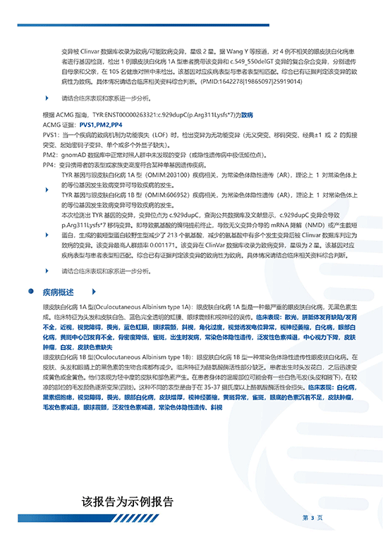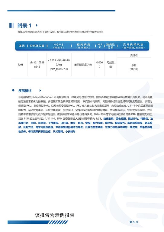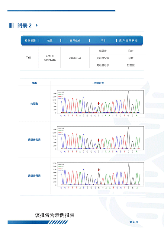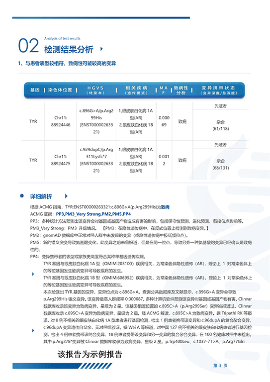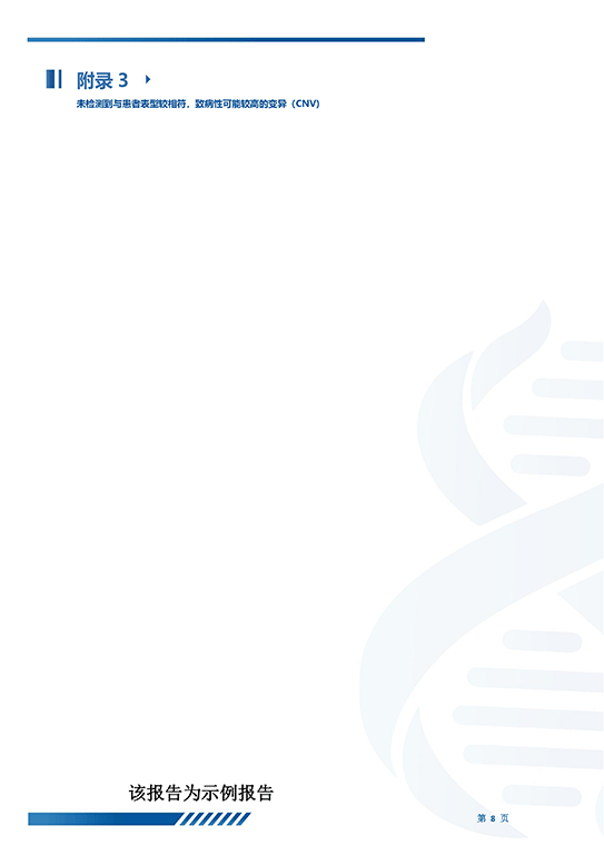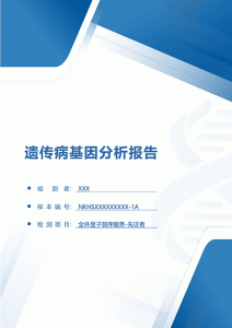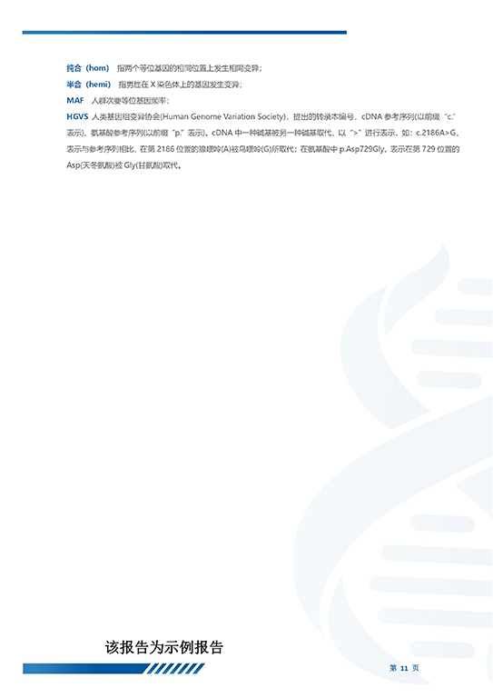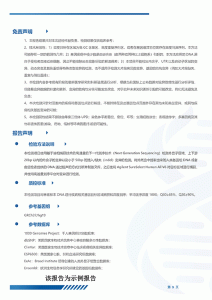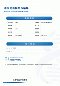 报告模板-遗传病基因分析辅助诊断报告-先证者(全外显子) WES产品模式 通过使用全外显子捕获探针(Agilent、IDT)获得基因组的外显子区域,进行高通量测序,对委托人的SNP、InDel两种变异类型进行检测,结合委托人相关的临床信息,遵循ACMG解读指南,发现与临床信息相关的致病性变异,从而进一步指导临床诊断、治疗以及家庭未来生育计划等。 全外显子组测序分析(先证者模式)仅对先证者进行全外显子组测序通过生物信息学分析、 数据过滤及 Sanger 测序验证,寻找疾病致病基因变异 全外显子组测序分析(核心家系模式)对先证者及其父母同时进行全外显子组测序通过生物信息学分析、 数据过滤、 家系共分离及Sanger 测序验证,寻找疾病致病基因变异,可显著提高诊断率 全外显子测序产品主要包括先证者模式和家系模式,先证者模式仅对先证者进行全外显子组测序,核心家系模式是对先证者及其父母同时进行全外显子组测序。我们使用的Aglient或IDT捕获探针捕获全外显子,进行高通量测序,主要检测SNP、INdel两种变异类型,严格遵循ACMG解读指南,发现致病性变异,从而进一步指导临床诊断。重视家系检测,有效提升检出率。对于非特异性表型或者复杂的遗传病,若选择WES检测,推荐核心家系WES检测(患儿及其父母均进行WES检测),通过分析变异位点的遗传来源,可一次性过滤多数遗传模式不符位点提升分析效率和阳性率,且大幅缩短检测周期。其次,父母样本是否检测会影响致病性变异的证据使用:经过遗传模式分析出的新发变异,为强的PS2证据;无父母检测结果的新发变异只能给出PM6的证据,会直接影响到变异位点的评级。* PS2:患者的新发变异,且无家族史(经双亲验证)。注:仅仅确认父母还不够,还需要注意捐卵、代孕、胚胎移植的差错等情况。* PM6:未经父母样本验证的新发变异。 遗传病基因分析报告 1 2 3 4 5 6 7 8 9 10 11 12
