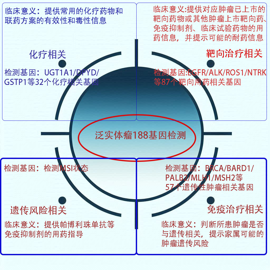 一次性检测188个基因的多种变异类型,同步解析靶向用药,免疫治疗、化疗用药和遗传风险,综合指导个体化治疗。