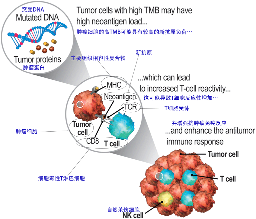 • 作用:高TMB的患者更可能从免疫检查点抑制剂(ICI)治疗中获益。肿瘤细胞中的异常蛋白被免疫细胞识别,激活免疫细胞对肿瘤的杀伤作用。